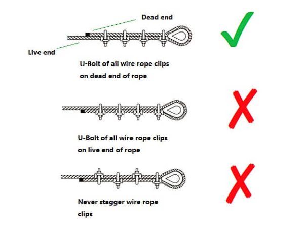 The dead-end of the wire rope (the end of the cut side) must be contacted with the U bolt, then the saddle should be on the live end.