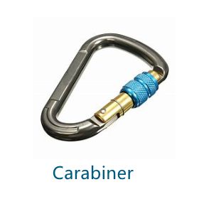 A carabiner is a metal loop with a spring-loaded entryway that will quickly open in order to detach a safety rig’s parts, such as the cable or line. The only way to open a carabiner is to manually push the gate away from the loop. This is one key difference between a carabiner and a more traditional snap hook—the snap hook can only release the cord or rope it holds if the spring gate is pushed towards the loop, instead of away from it.